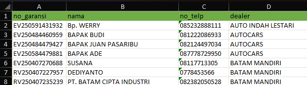 col A : no_garansi, col B : nama, col C : no_telp, col D : Tipe Mobil